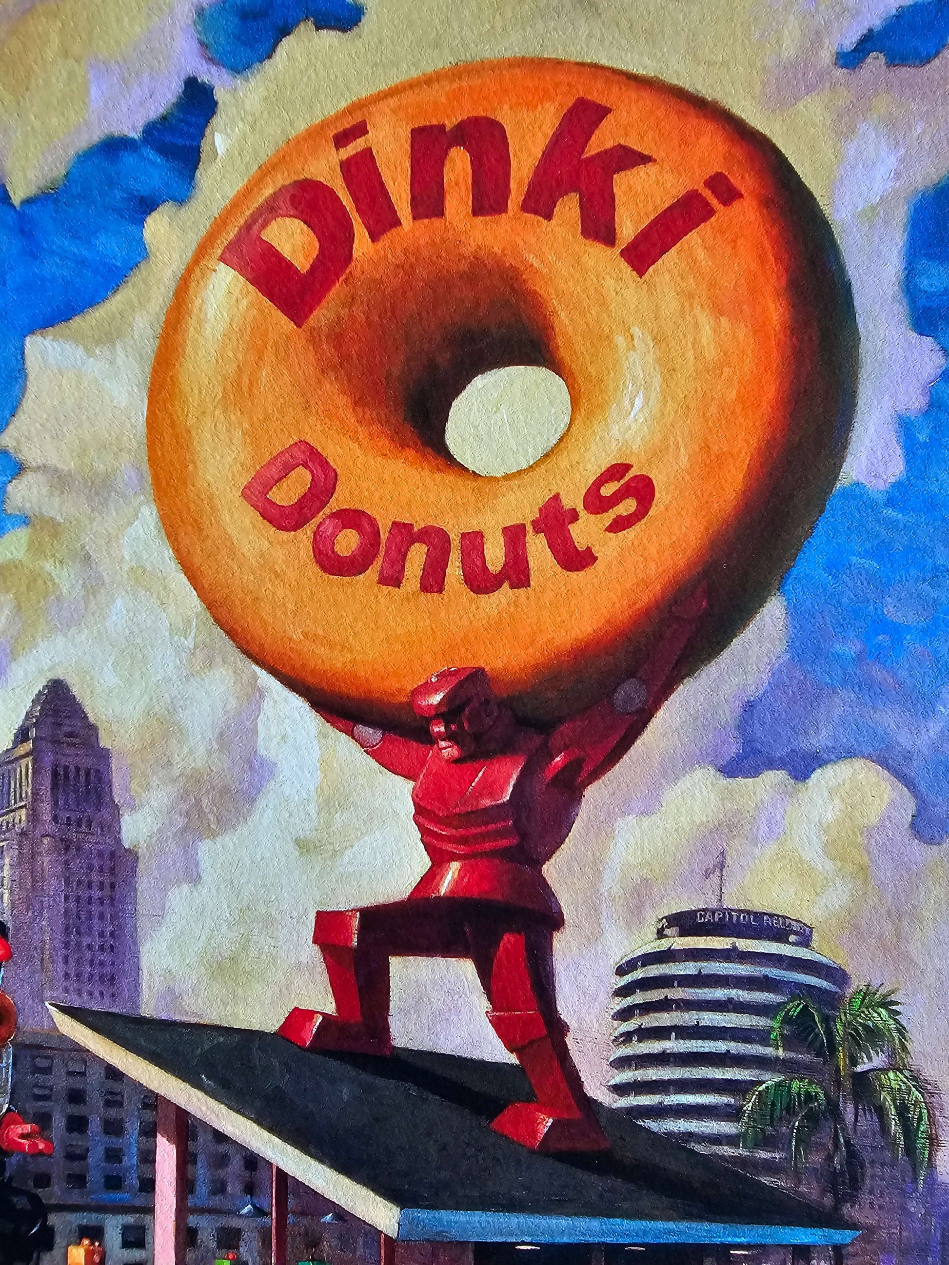 This piece depicts a dramatic scene where a robot is picking up a giant Donut from a drive-thru "dinky donuts". Other robots are enjoying donuts. Robot cars line the parking lot. Capitol Records is in the background.